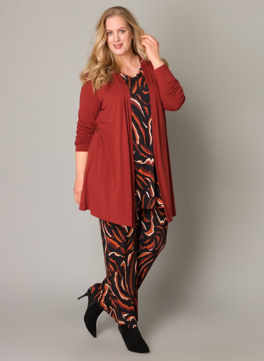 Een rechtvallende broek met wijde pijpen. Print in zwart, ecru, roest en bruin. Comfortabel met elastiek in de taille. Samenstelling: 94% viscose, 6% elastan.