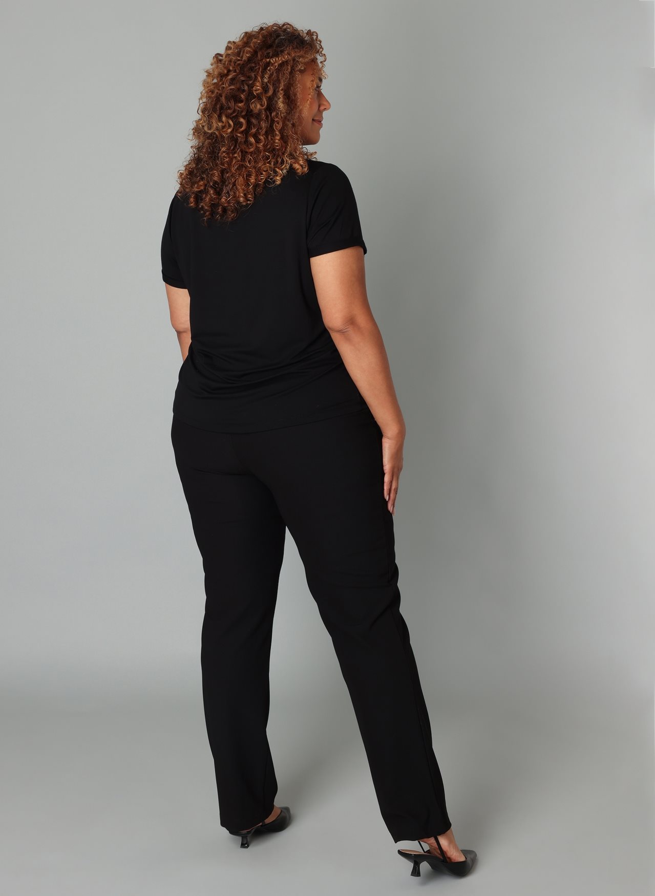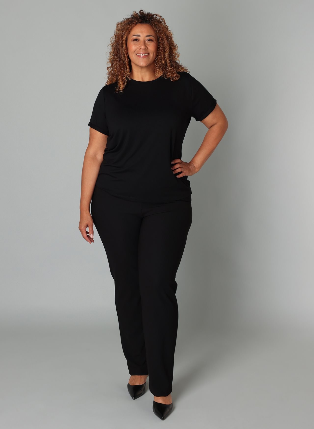 Deze broek in regular fit is uitgevoerd in een gladde, elastische kwaliteit die prettig aanvoelt en lang mooi blijft. In klassiek zwart is dit een perfecte basis voor eindeloze outfits, van printtops tot blazers.