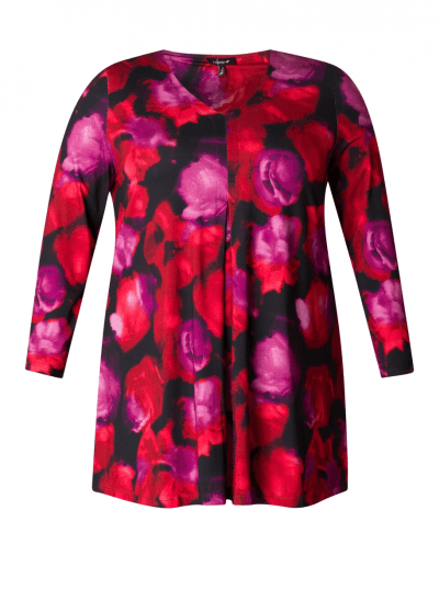 Tuniek met V-hals. Voor met stolpplooi. Kleuren rood, fuchsia, zwart, purper.