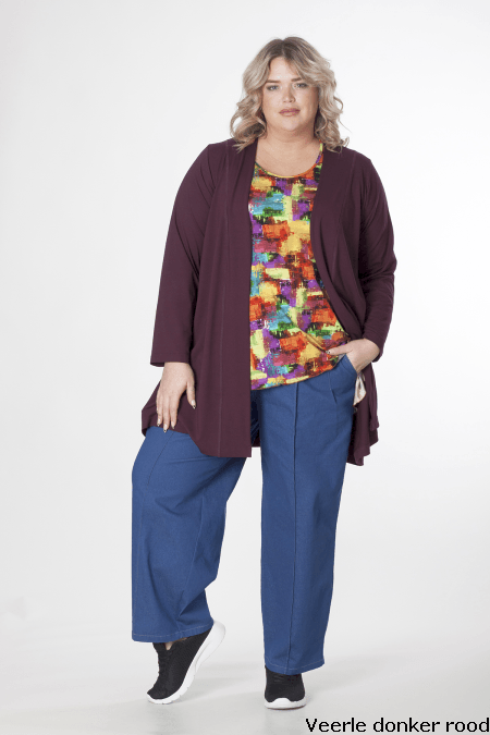 Exelle vest Veerle 9601TS 397 d.wine. Losvallend, tricot vest. A-line model. Lengte 99 cm. Wijnrood. Materiaal: 95% viscose, 5% elastan.