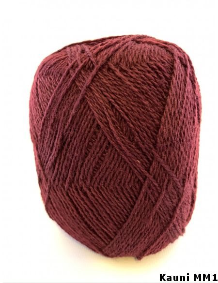 Kauni MM is een effen rode wol. . Breinaalden 3 of 4 mm. Een bol van 150 gram is ongeveer 600 m. De wol kan worden gewassen op 30 graden wolwasprogramma. Stekenverhouding 23 st x 29 nld = 10 x 10 cm.