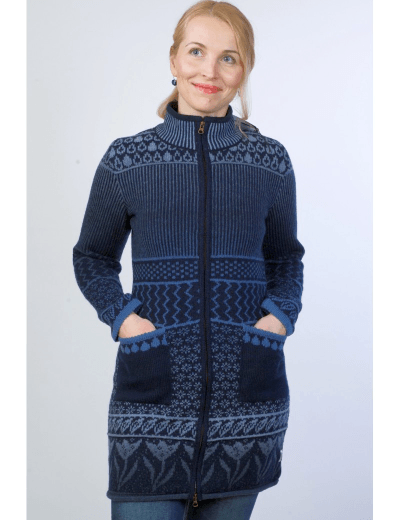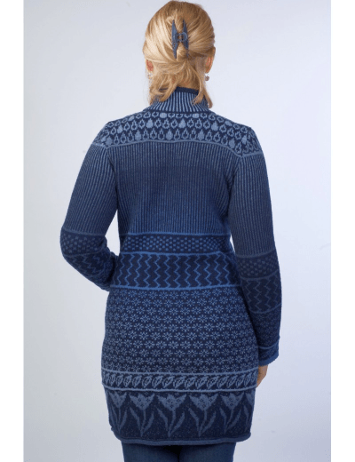 Lang en levendig gevilt wollen vest met een groot bloemenpatroon aan de voor- en achterkant. Het vest heeft een koele kleurtoon en een rits.