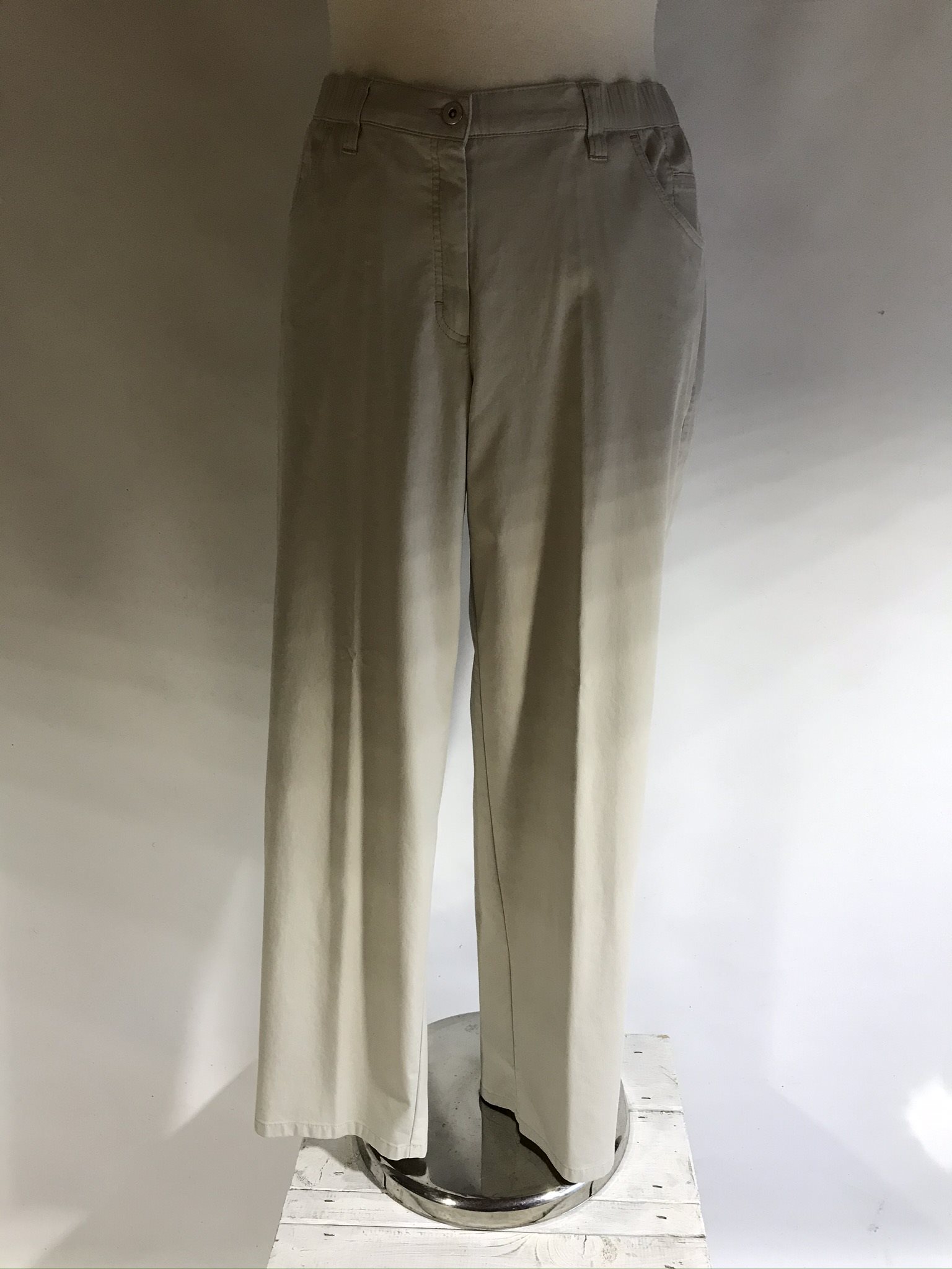 Kj Brand broek Babsie 23020 6023/016. Een beige broek in  5-pocket model. De broek heeft riemlussen, elastiek in de taille en een rits- en knoopsluiting. Dit model heeft een wijde bovenbeenruimte. Materiaal: 60% katoen, 37% polyamide, 3% elastan.
