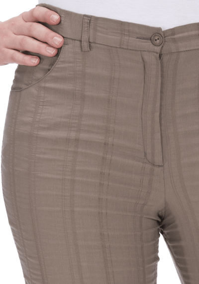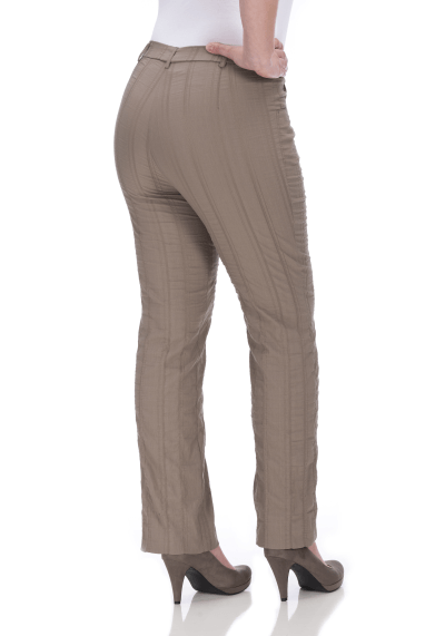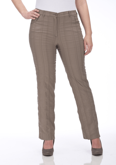Broek Bea van KJ Brand: 23801, 7615/814. Dit is een taupe kleurige broek van soepele krinkelstof met rechte pijpen. De broek heeft elastiek in de taille met ritssluiting en een knoop. Materiaal: 47% katoen, 46% polyester, 6% viscose,  2% elastan.