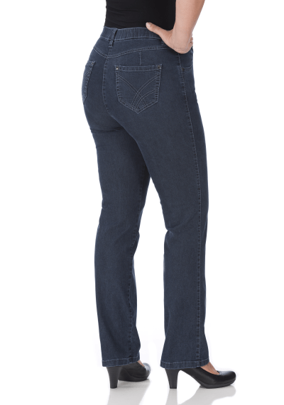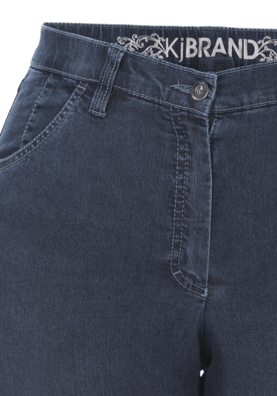 Een comfortabele broek van KJ Brand: Betty 24618, 9244/606. Deels elastiek in de taille met rits en knoopsluiting. Een five-pocket model. Donkerblauw. Samenstelling: 97% katoen,3% elastan.
