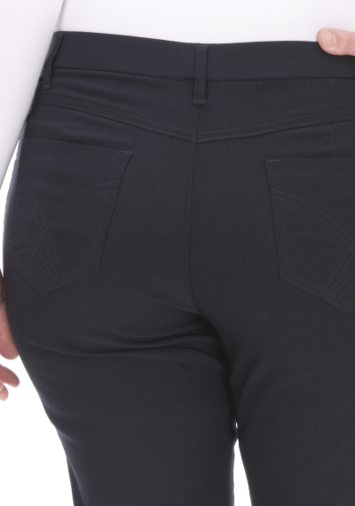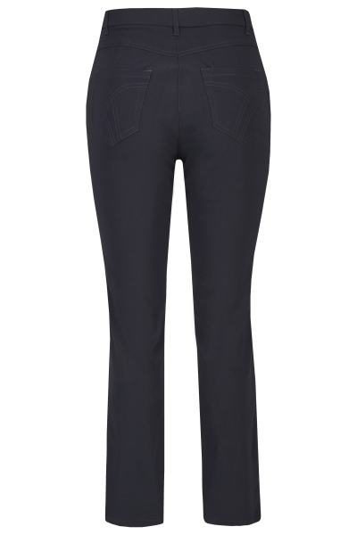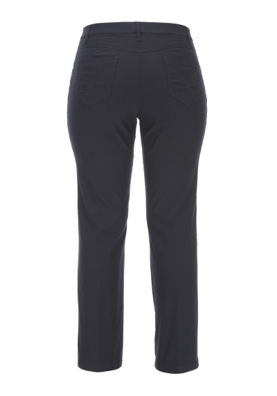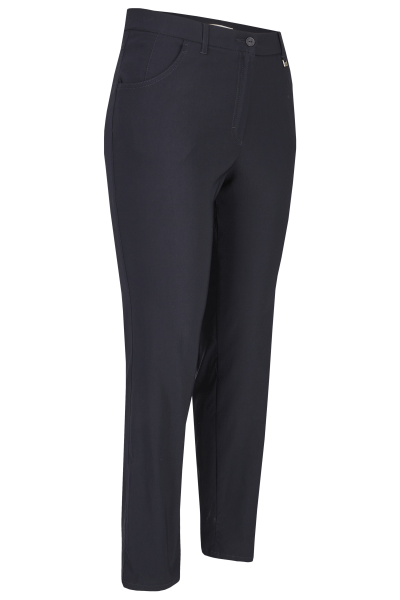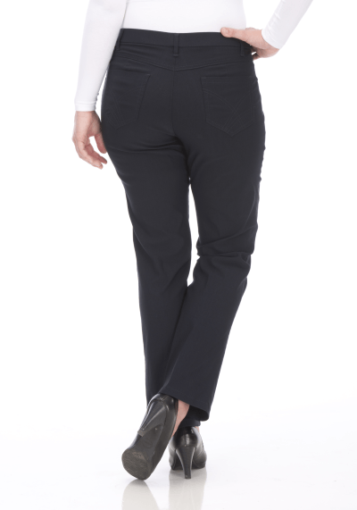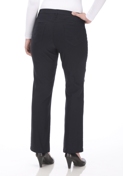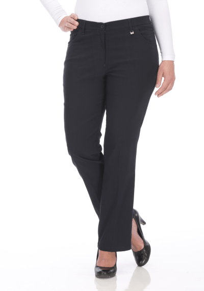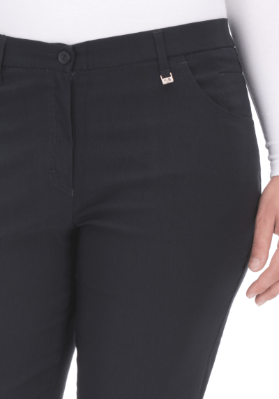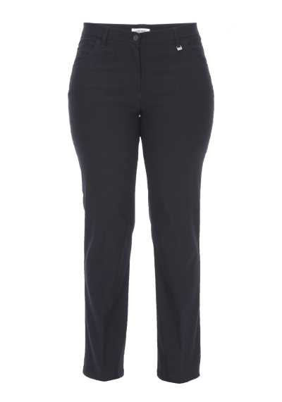 Broek van Kj Brand: Betty 24618 6046/106. Een 5-pocket model in donkerblauw. Deze broek heeft recht pijpen, riemlussen, ritssluiting en knoop. Extra lengte maten. Materiaal: 80% viscose, 17% polyamide, 3% elastan.