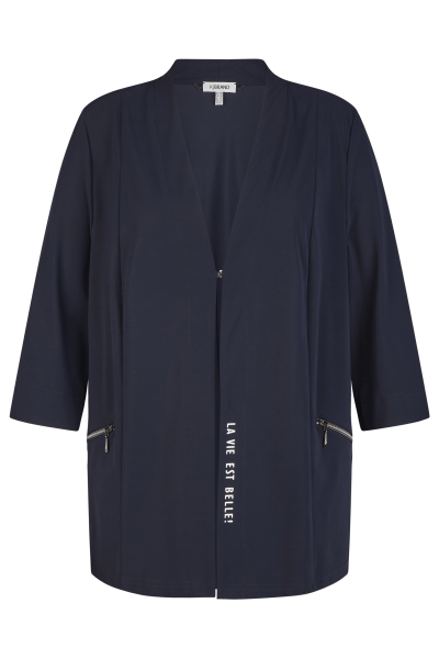 Een losvallend, donkerblauw, comfortabel, kreukvrij jasje. Zakken met ritssluiting. Lengte: 82 cm.
