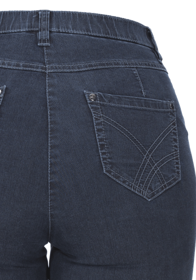 Super stretch. Deze Betty heeft deels elastiek in de taille, een comfortabele bovenbeenwijdte, ritssluiting met knoop, riemlussen, super stretch. Een mooie donkere wassing. Materiaal: 78% katoen, 18% polyester, 4% elastan.