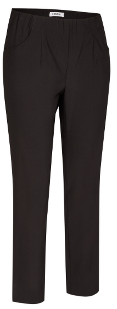 Comfortabele zwarte broek van KJ Brand: Susie 25300, 6046/001. Deze broek heeft elastiek in de taille, een zakje aan de binnenkant van de tailleband, prettige taillehoogte, prettige bovenbeen wijdte en smal toelopende broekspijpen. 2 steekzakken.Materiaal: 80% viscose, 17% polyamide, 3% elastan.