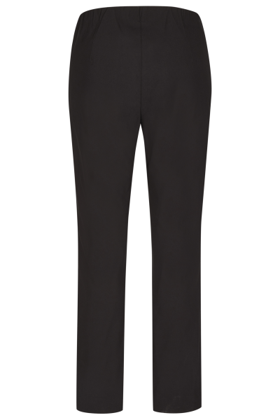 Susie XS van Kj Brand: 25350 6046/001. Dit is een comfortabele effen zwarte broek en elastiek in de taille. 2 steekzakken. De broek heeft comfortabele taillehoogte en een smalle bovenbeen wijdte. Materiaal: 80% viscose, 17% polyamide, 3% elastan.