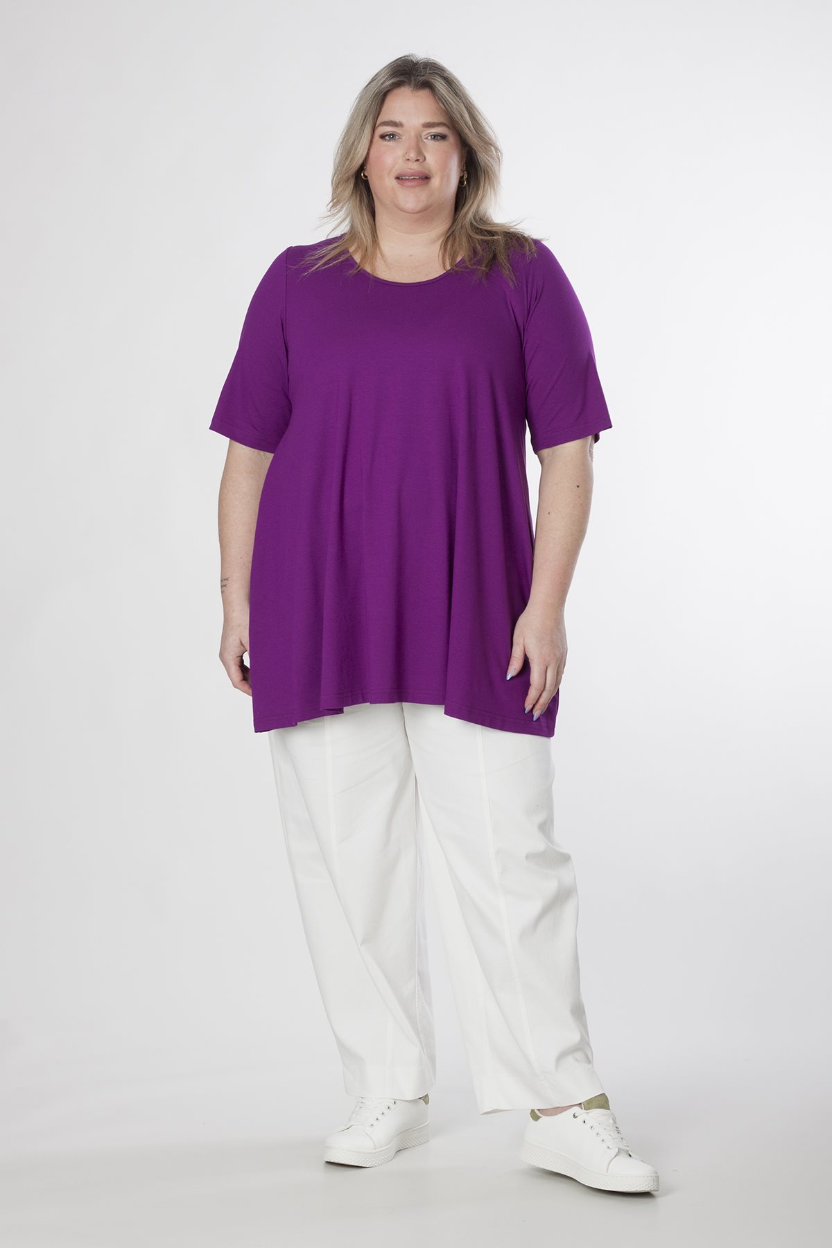 Heuplange tuniek Tronika in kleurrijke zomer prints. Dit is ons favoriete shirt voor de plussize vrouw. Aangesloten rond de buste met mooie ronde halslijn, naar onderen wijd uitlopend. Half lange mouwen. Gemaakt van een fijne viscose/elastaan stretch jersey. onggeveer lengte 88 cm 95% micromodal 5% elastan