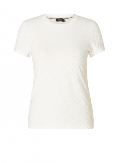 Dit T-shirt met subtiele zigzagstructuur is gemaakt van 95% katoen en 5% elastaan, wat zorgt voor een comfortabele en flexibele pasvorm. Verkrijgbaar in frisse Pastel Blue en Off White. Lengte 70 cm 95% Cotton 5% Elasthan