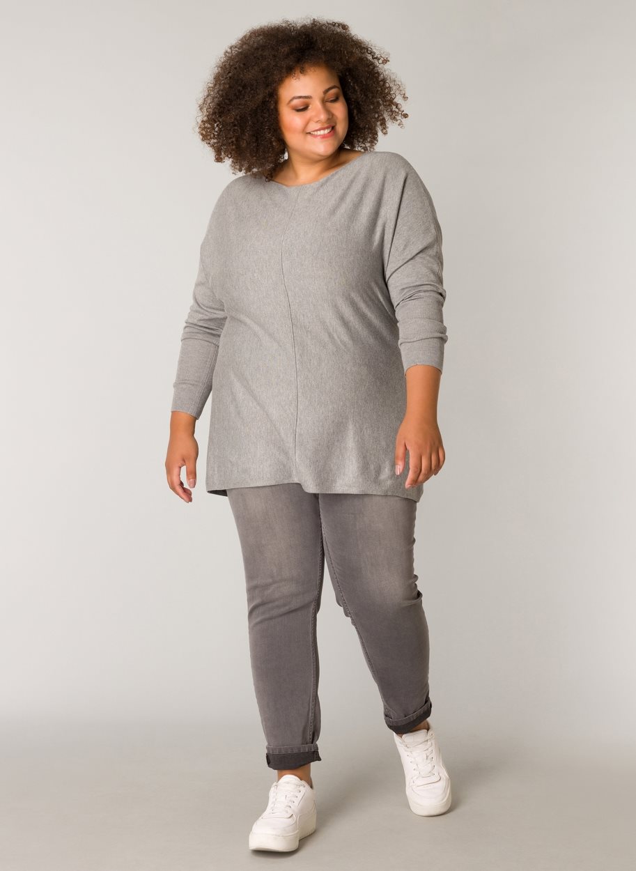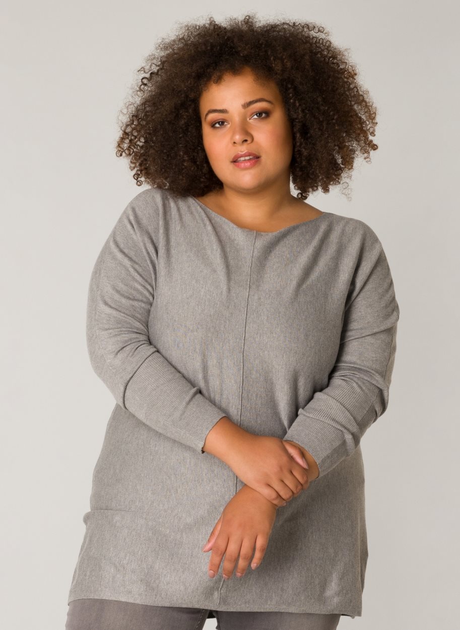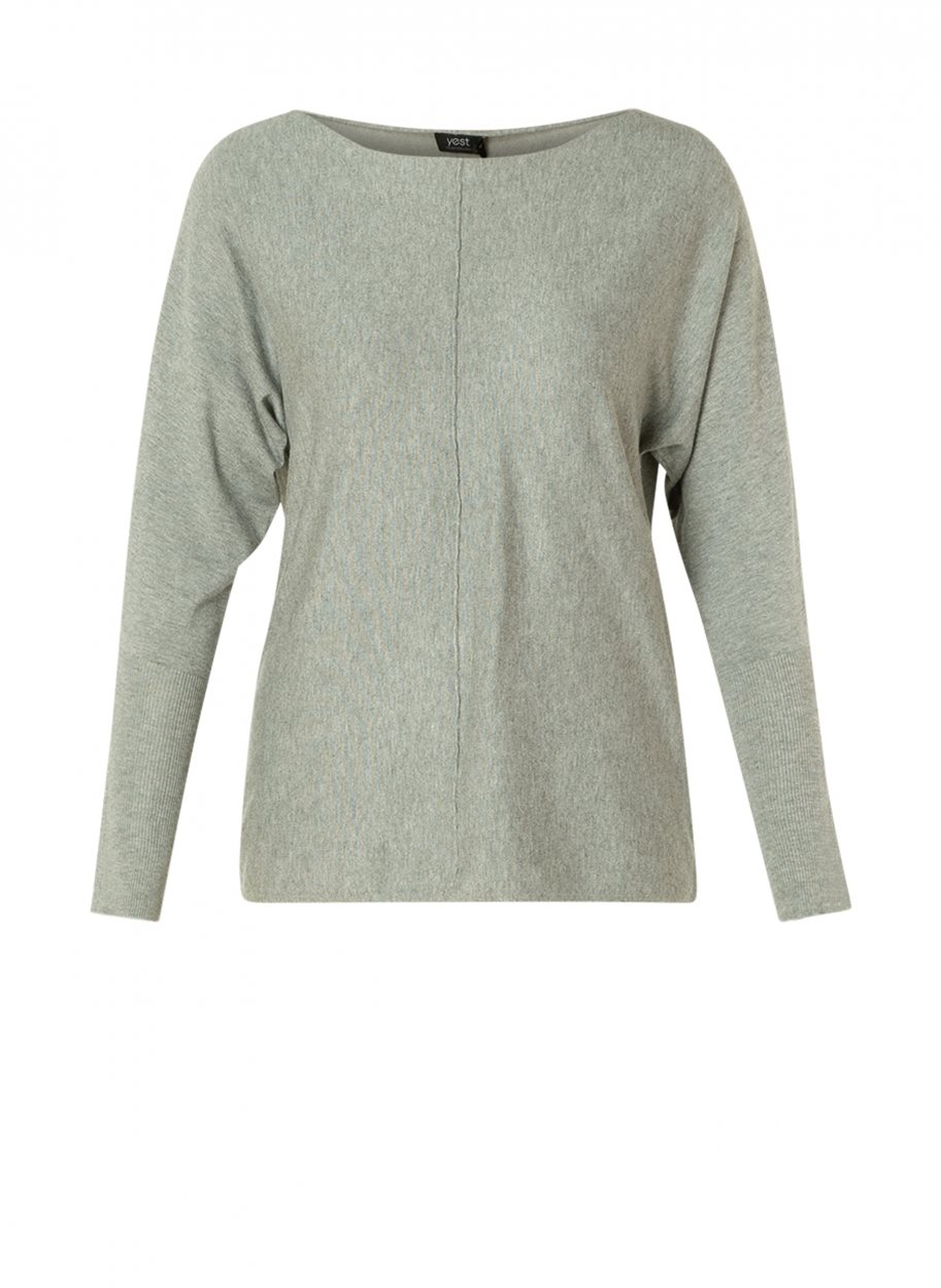 Yesta trui Vina A003465 grijs. Een grijze trui met aangeknipte lange mouwen. Een rechtvallend model met een ronde hals. Lengte: 77 cm. Materiaal: 80% viscose, 20% nylon.