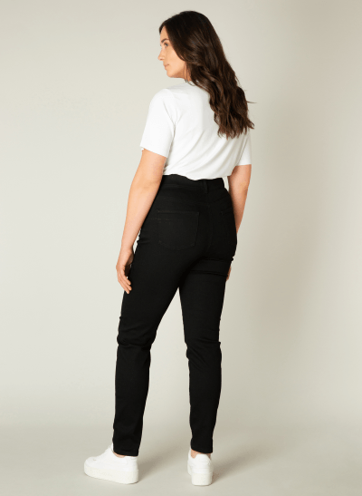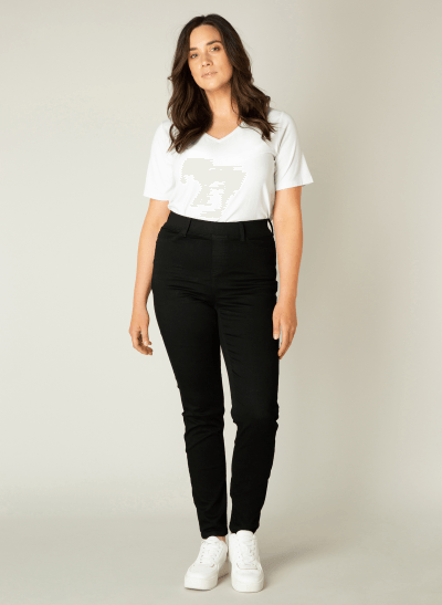 Tessa 7000008 base level curvy. Aansluitend model met push-up effect. Elastiek in de taille en 2 zakken achter. Zwarte wassing met oranje stiksels. Materiaal: 67% katoen, 29% polyester, 4% elastan.