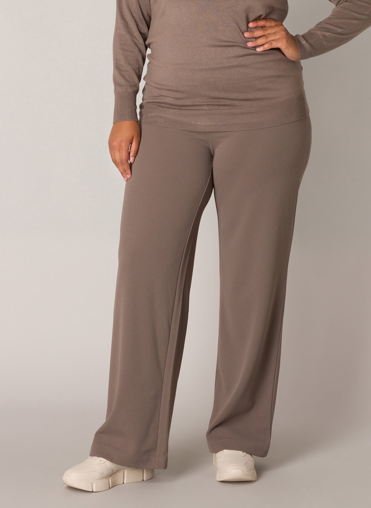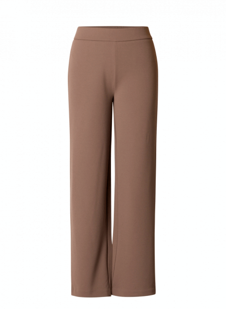 Een taupe kleurige broek.. Rechte, wijde pijpen. Elastiek in de taille. Samenstelling: 97% gerecycelde polyester, 3% elastan.