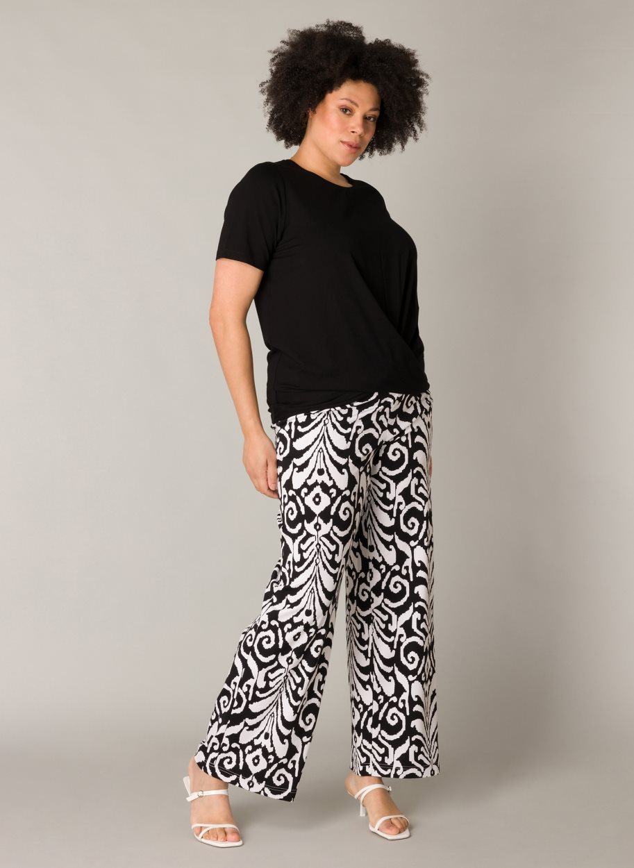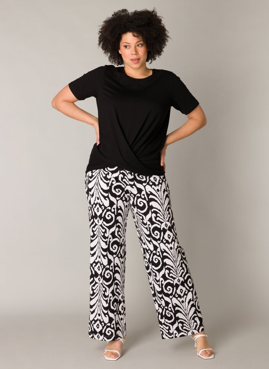 Yesta broek Hajar A004479. Comfortabel. Zwart/wit. Samenstelling: 64% viscose, 28% polyester, 8% elastan.