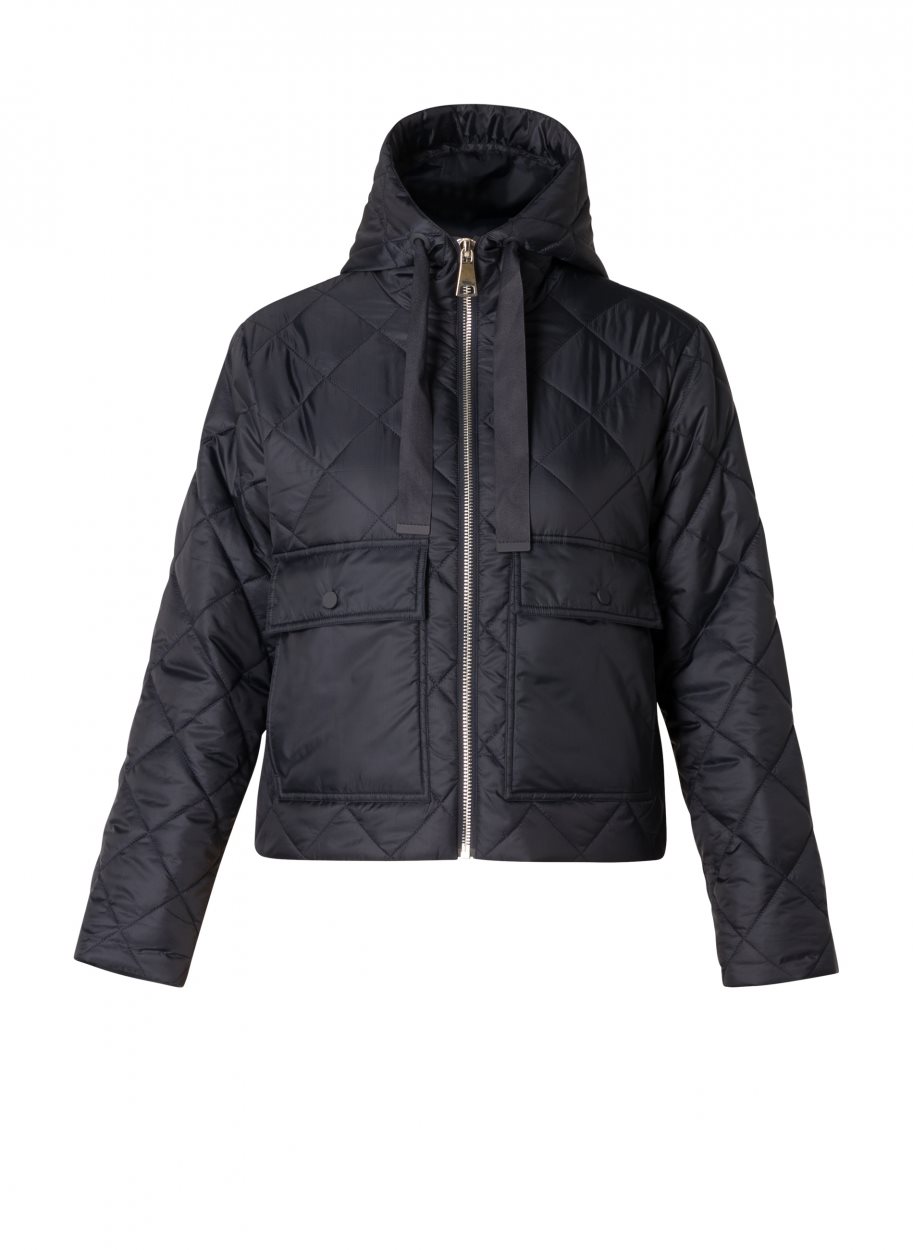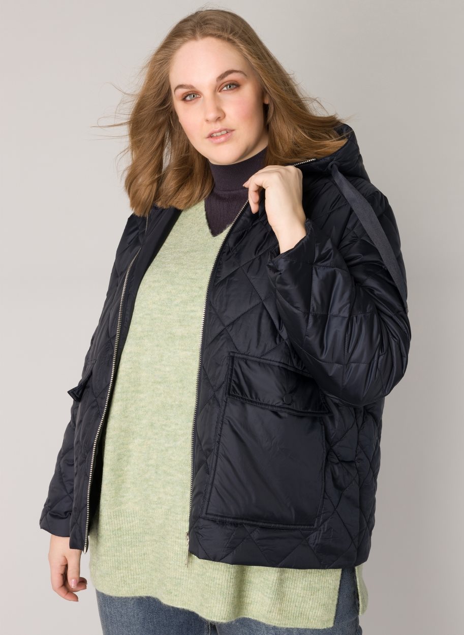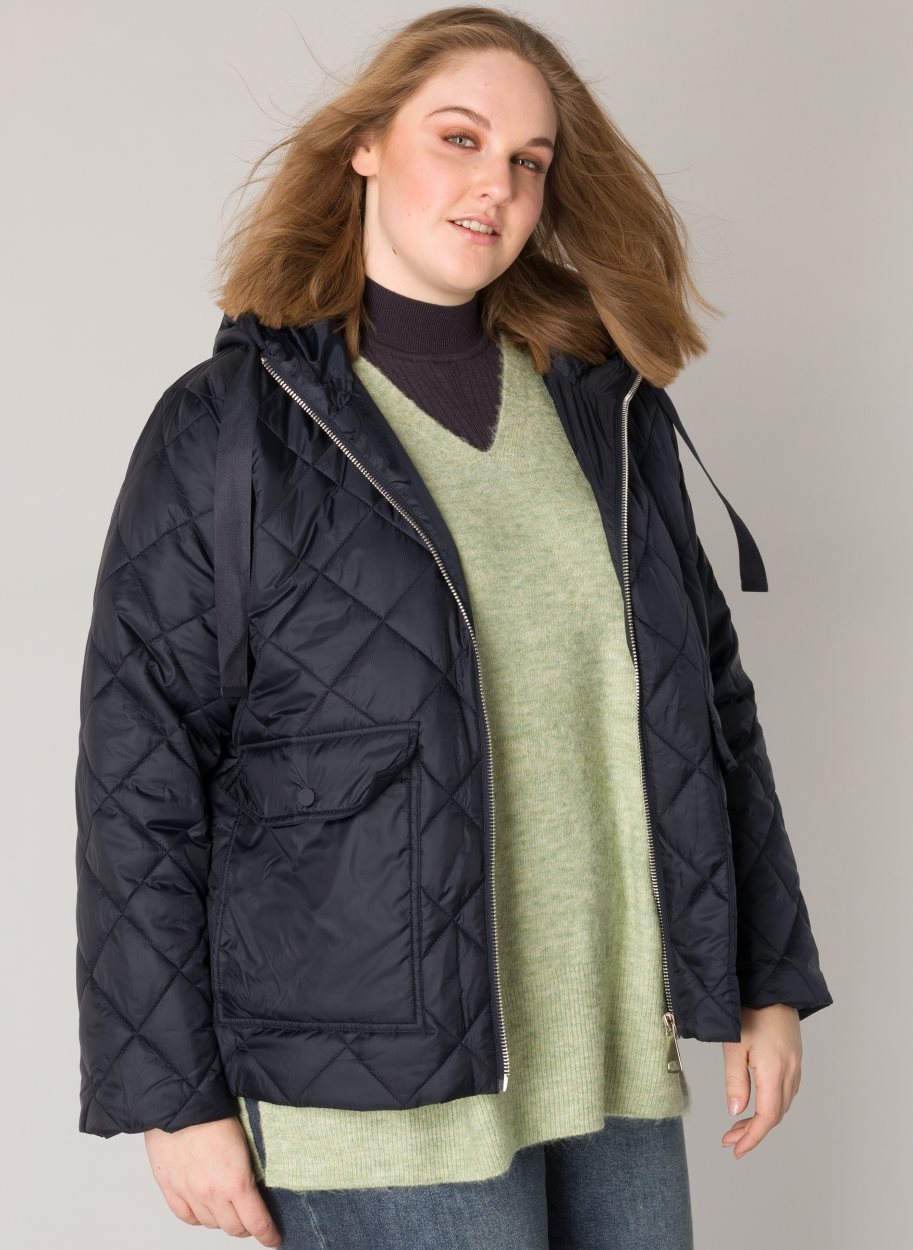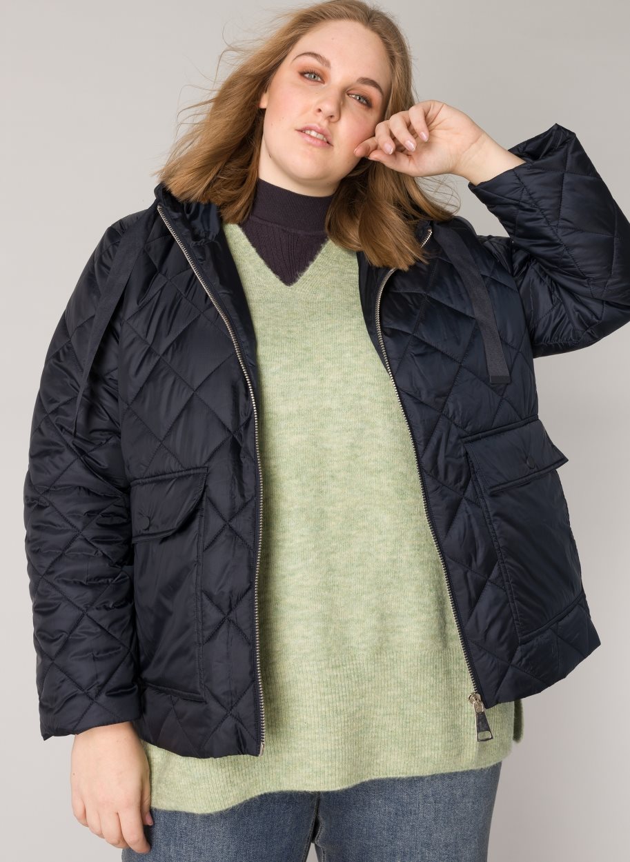 Korte gewatteerde jas met capuchon van Yesta in de kleur blue-grey. Deze jas is waterafstotend en heeft een opvallende zilverkleurige rits, grote opgestikte zakken met een klep en splitjes met druk-knopen in de zijnaad.