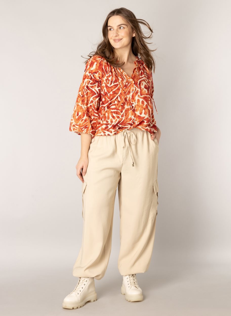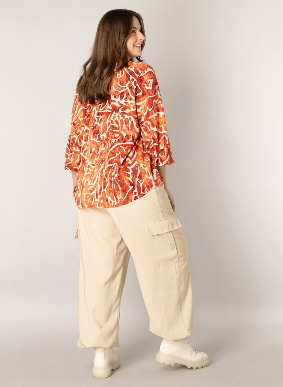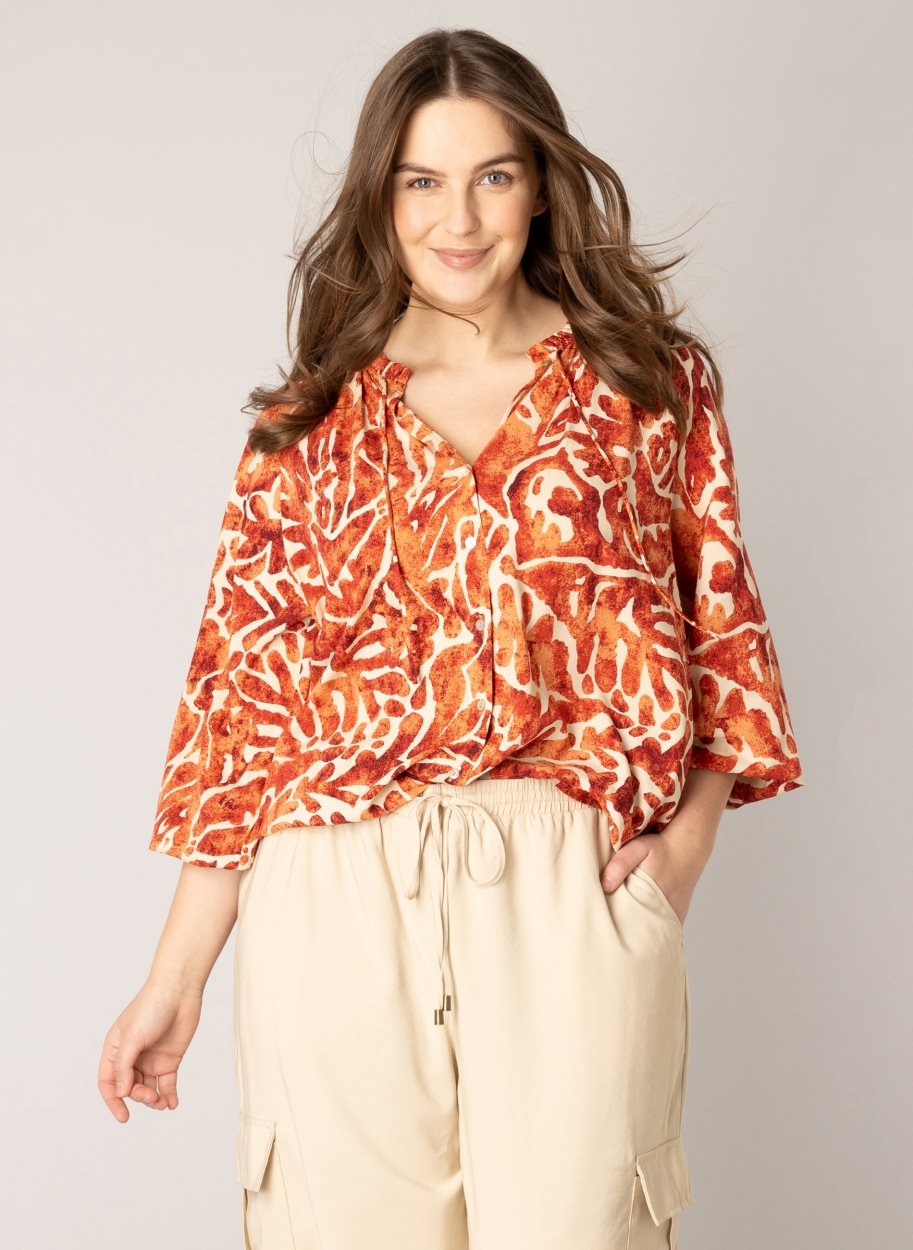 De Fay is een vrouwelijke blouse met een ronde halslijn en wijde mouwen met een elastisch manchet. Verkrijgbaar in de kleur Soft Red multicolour. Lengte: 77 cm. Mateeriaal: 100% ecovero viscose.