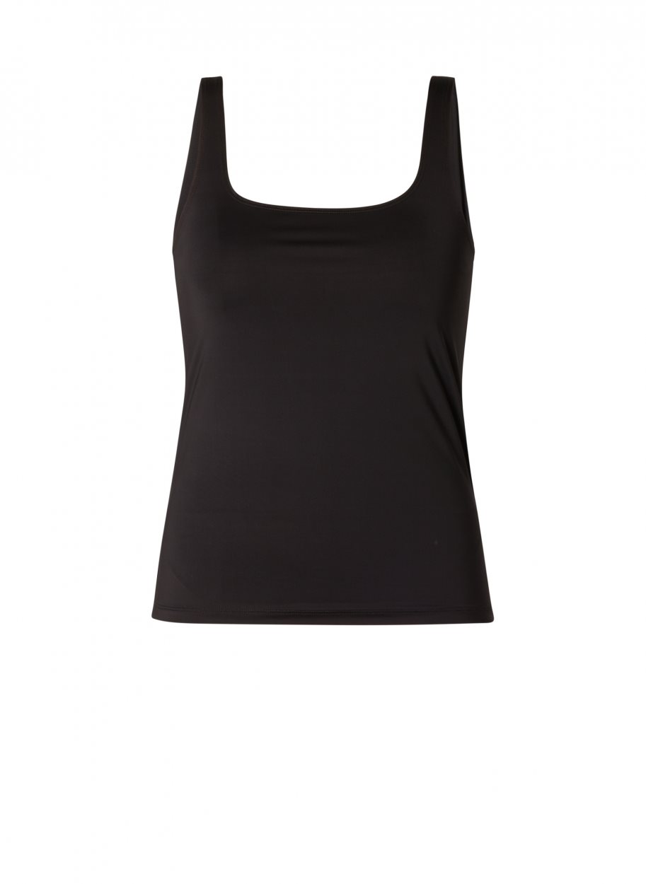 Een zwarte top. Lengte 72 cm. Gladde stof. Samenstelling: 87% polyamide, 13% elastan.