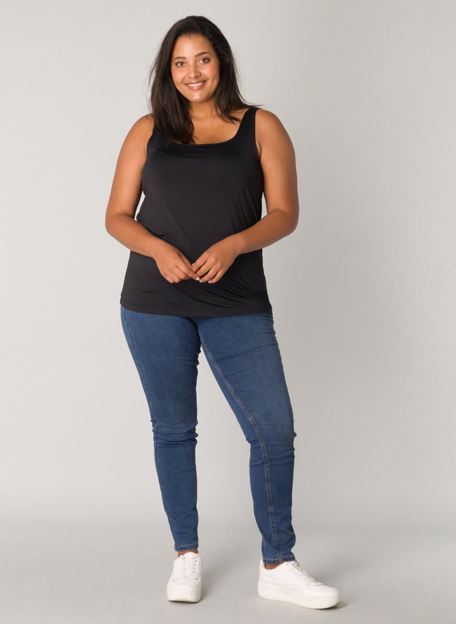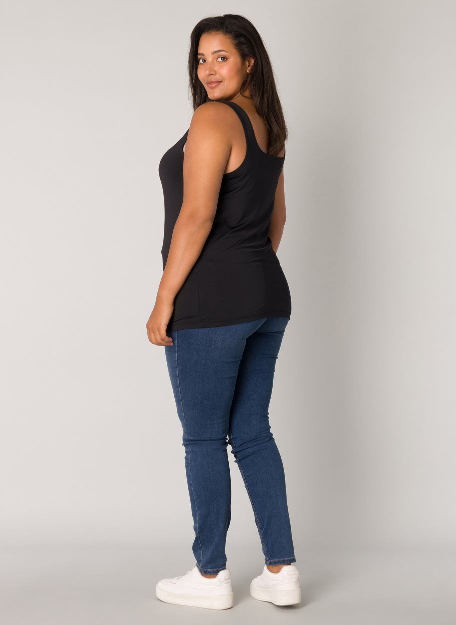 Een zwarte top. Lengte 72 cm. Gladde stof. Samenstelling: 87% polyamide, 13% elastan.