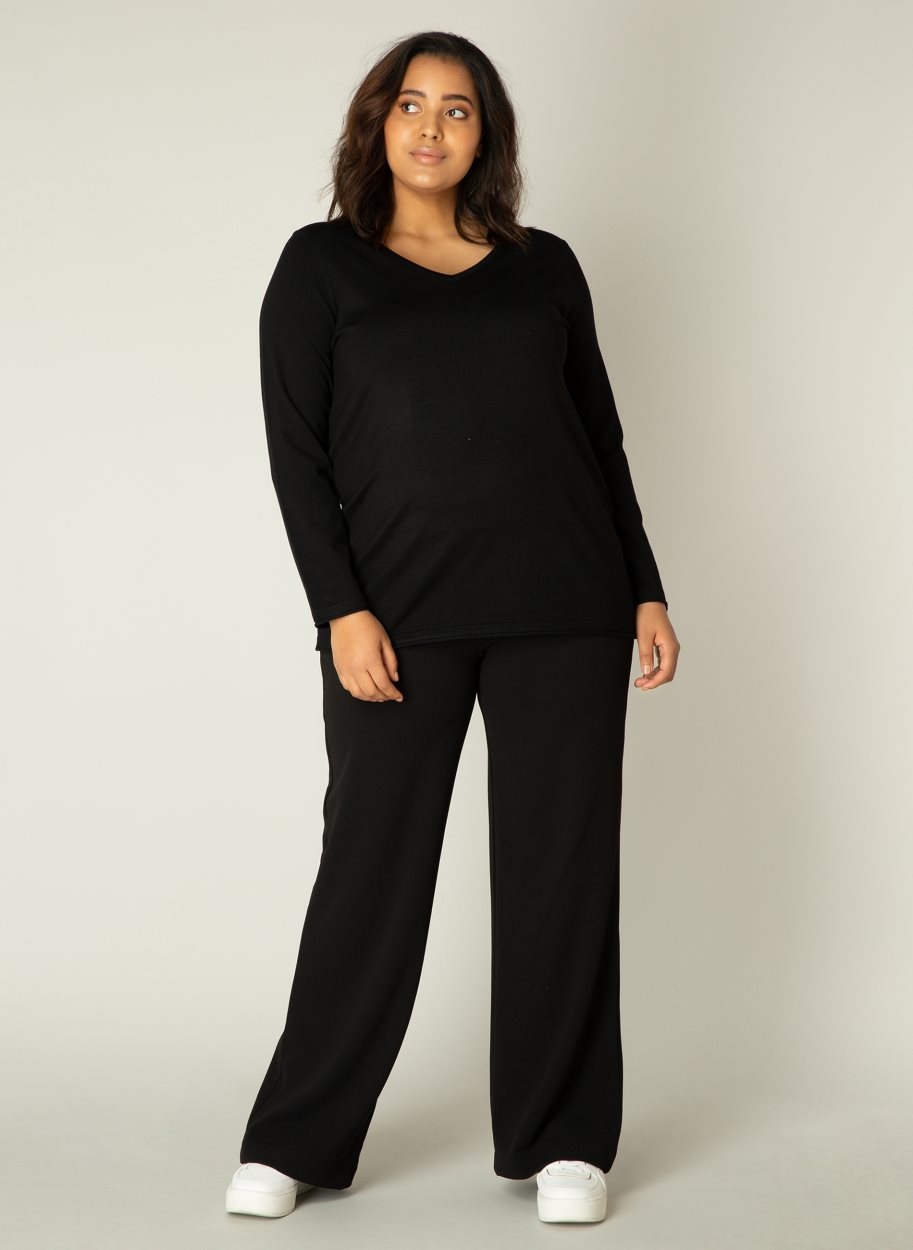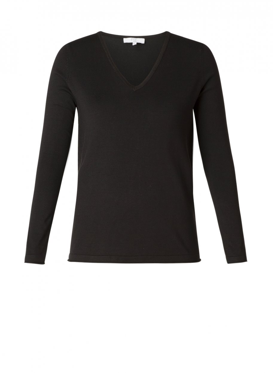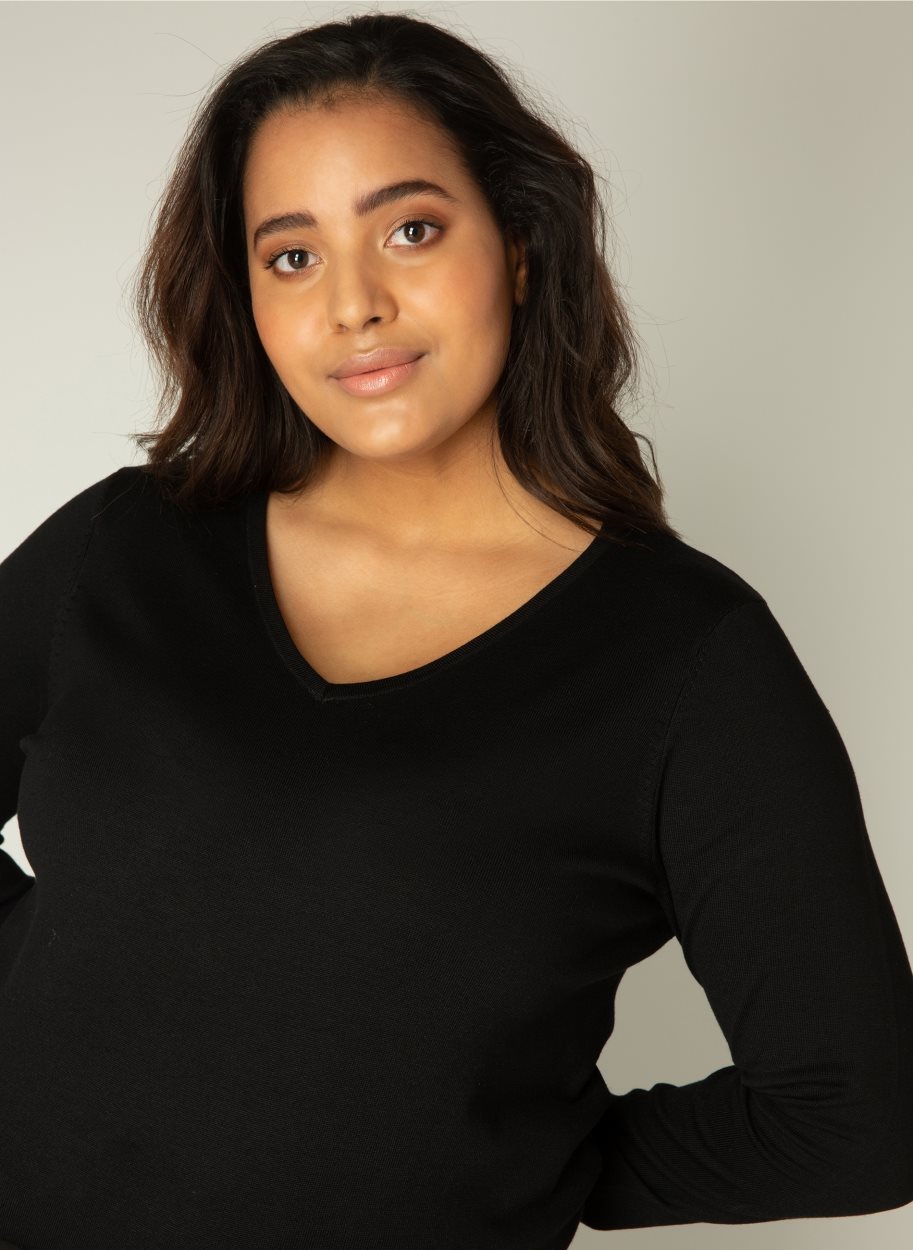 Een zwarte trui. regular fit, Lengte 76 cm. Breisel: 80% viscos, 20% nylon.