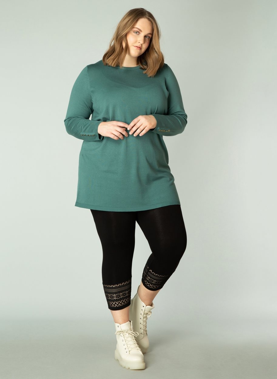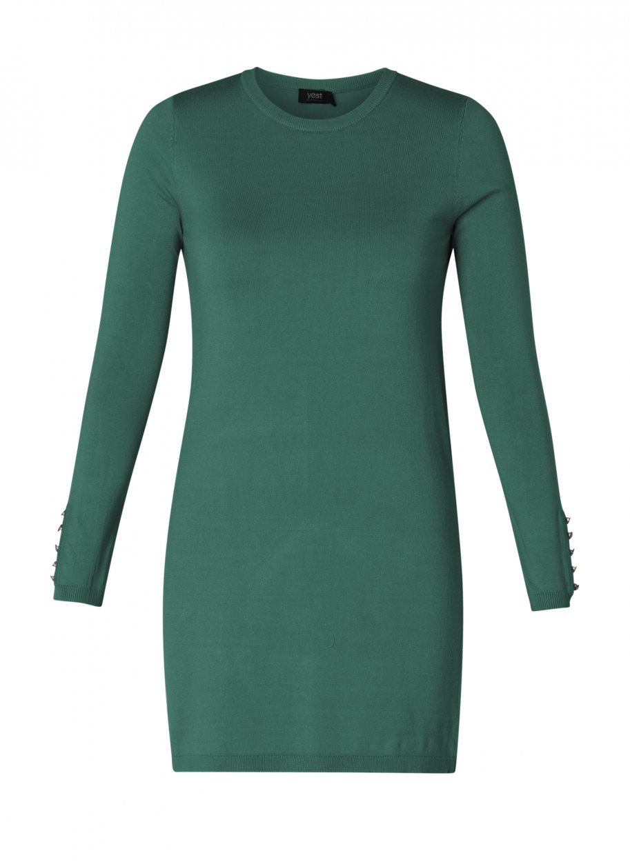 Een groene trui. Lange mouwen met bronzen sierknoopjes aan de mouwboorden. Lengte: 86 cm. Samenstelling breisel: 80% viscose, 20% breisel.